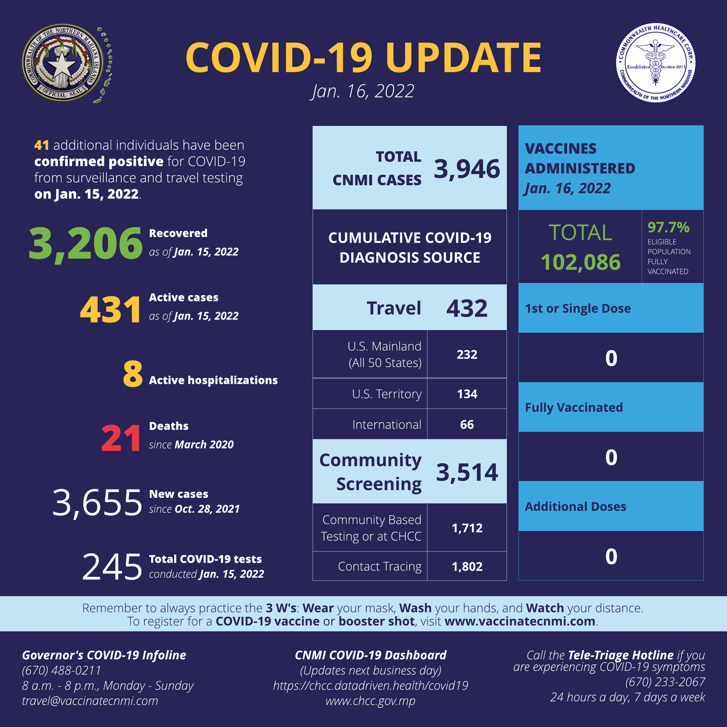 (CHCC) — Forty-one additional individuals have been confirmed positive for Covid-19, bringing the CNMI total to 3,946 cases since March 28, 2020. The individuals have been isolated and are actively monitored.