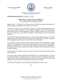“If a classified employee is convicted of official misconduct (a misdemeanor), they would lose their job. Under Bill 30, the bill’s author could be convicted of the same thing and continue to run for public office because elected officials can run for office provided that they are not convicted of a felony,” the governor’s office stated before calling on the Guam Legislature to uphold the veto.