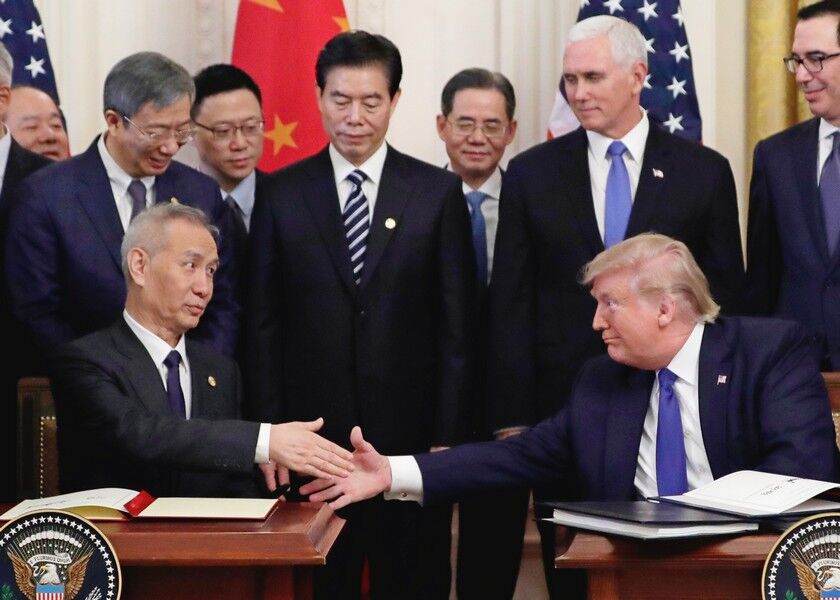 President Donald Trump shakes hands with Chinese Vice Premier Liu He after signing a trade agreement in the East Room of the White House, Wednesday, in Washington, D.C. AP