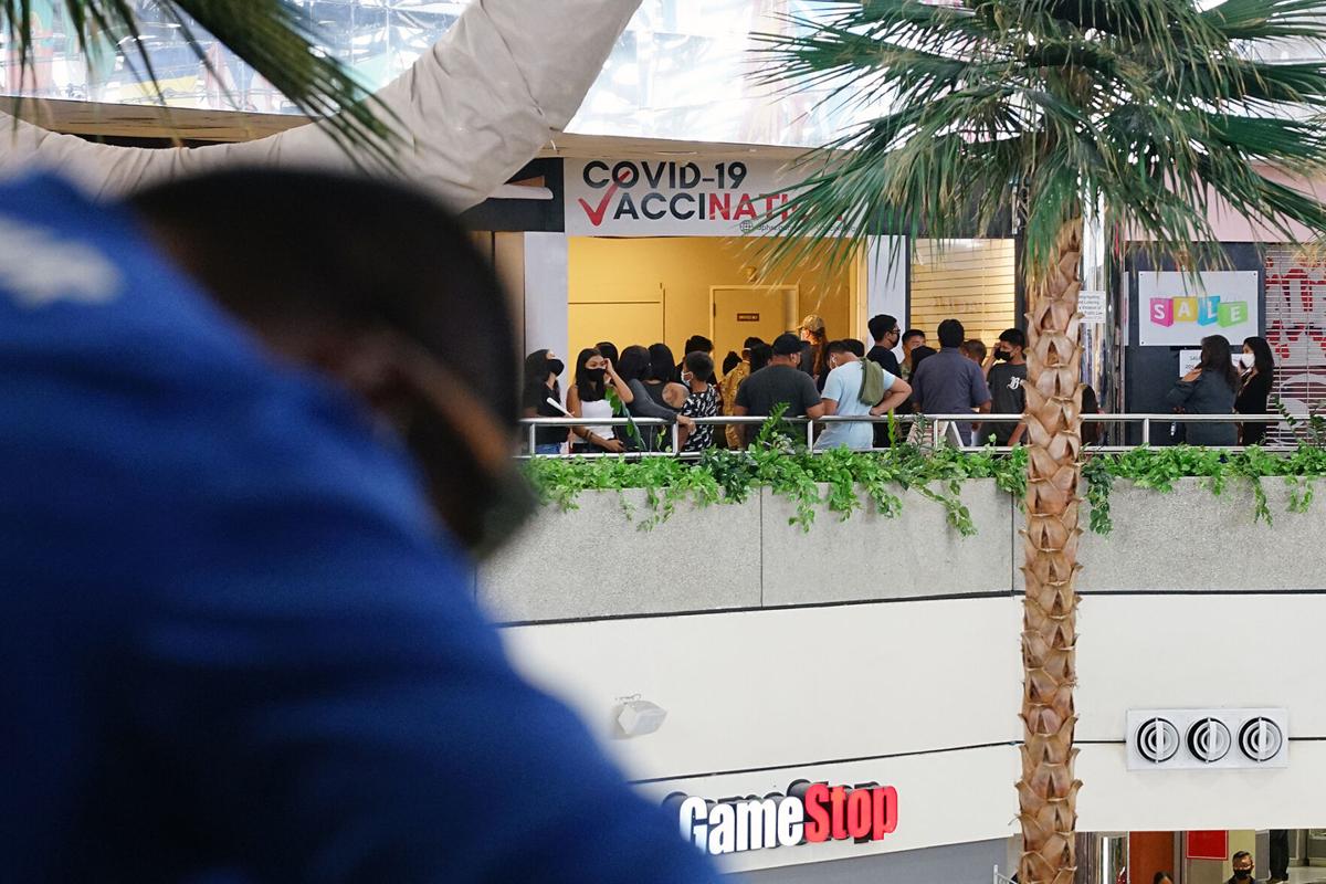 Individuals waiting to receive the Covid-19 vaccine stand in line that circles the second floor of the Micronesia Mall on Saturday afternoon.