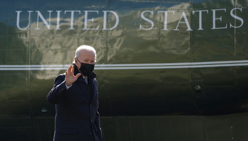 President Joe Biden waves as he returns via Marine One to the White House in Washington, D.C., Jan. 10, 2022.
