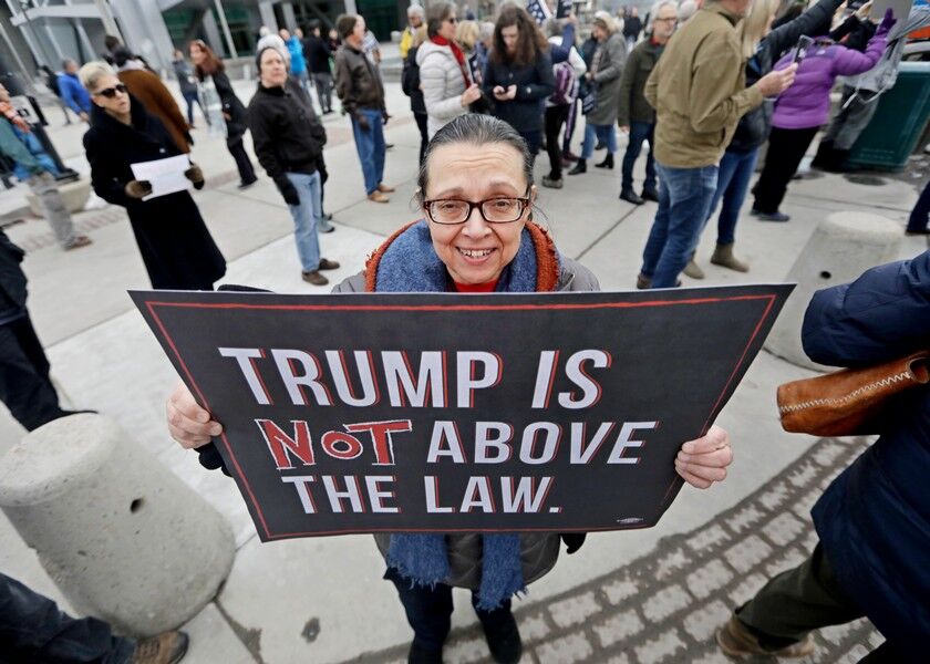 Marcie Hanks gathers with others outside the office of Republican Sen. Mitt Romney to call on him to push for a full and fair impeachment trial in the Senate with pertinent testimony and evidence during a rally, Thursday, in Salt Lake City. AP