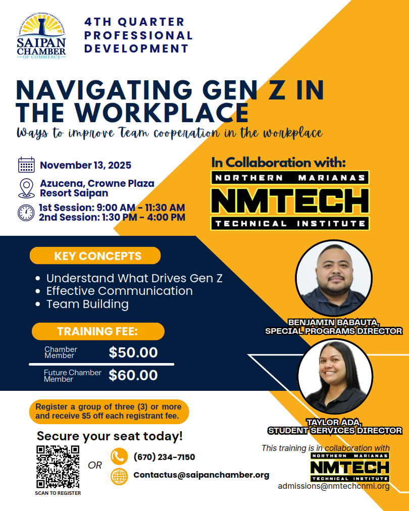 (SCC) — The Saipan Chamber of Commerce, in partnership with the Northern Marianas Technical Institute, is proud to announce its 4th quarter professional development workshop, “Navigating Gen Z in the Workplace: Strategies to Improve Team Cooperation and Communication,” to be held at Azucena, Crowne Plaza Resort Saipan, a valued Saipan Chamber member.