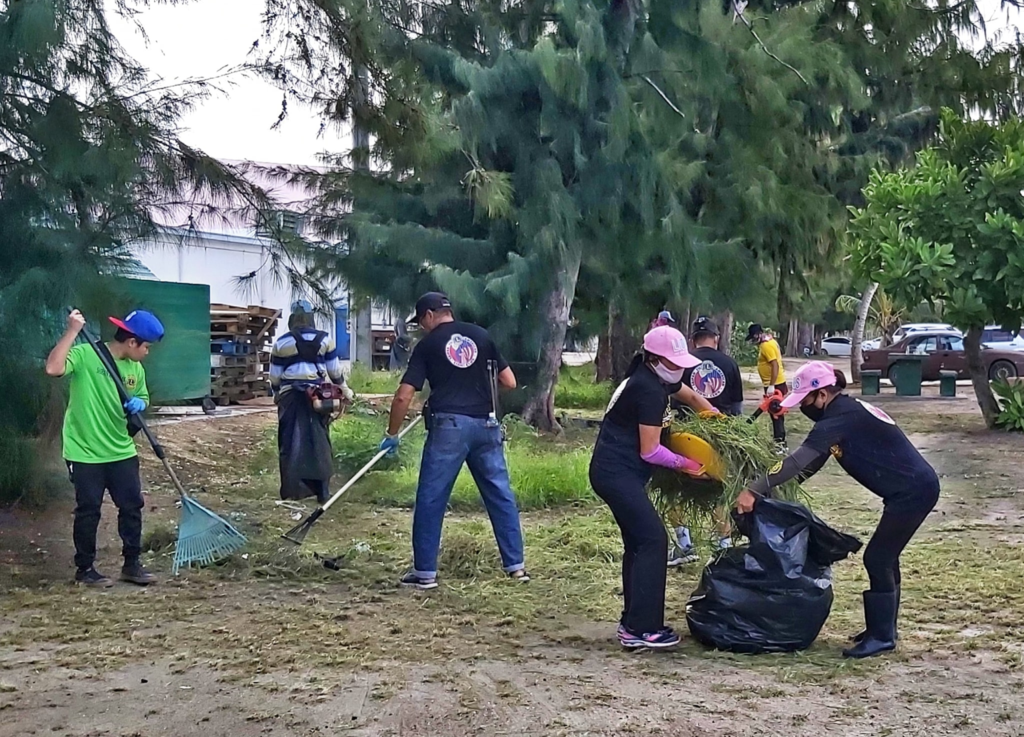 Saipan Lions Clubs members work on the grounds of the Sugar Dock Beach Park during a cleanup drive held early this month. Contributed photo