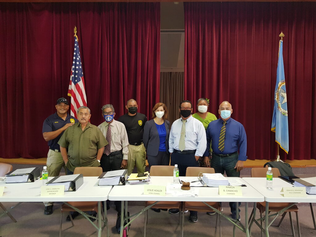 Parole Board chairman Ramon B. Camacho poses for a photo with board members Vincent Borja, Jose Camacho, Ignacio Mendiola, Cecilia K. Selepeo, legal counsel Leslie Healer and parole officers.