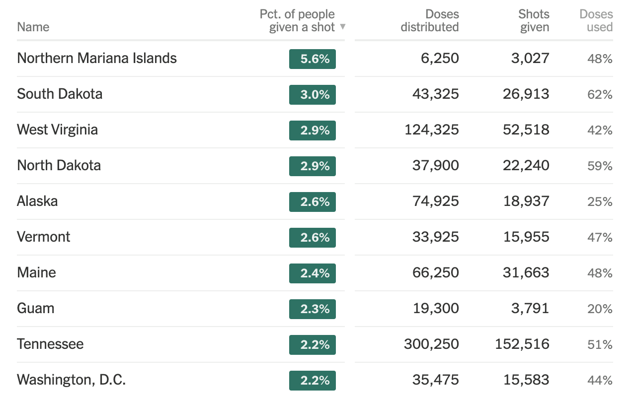 Guam has administered the vaccine to 2.3% of its population, ranking 10th in the nation in terms of how many shots have been distributed and given.