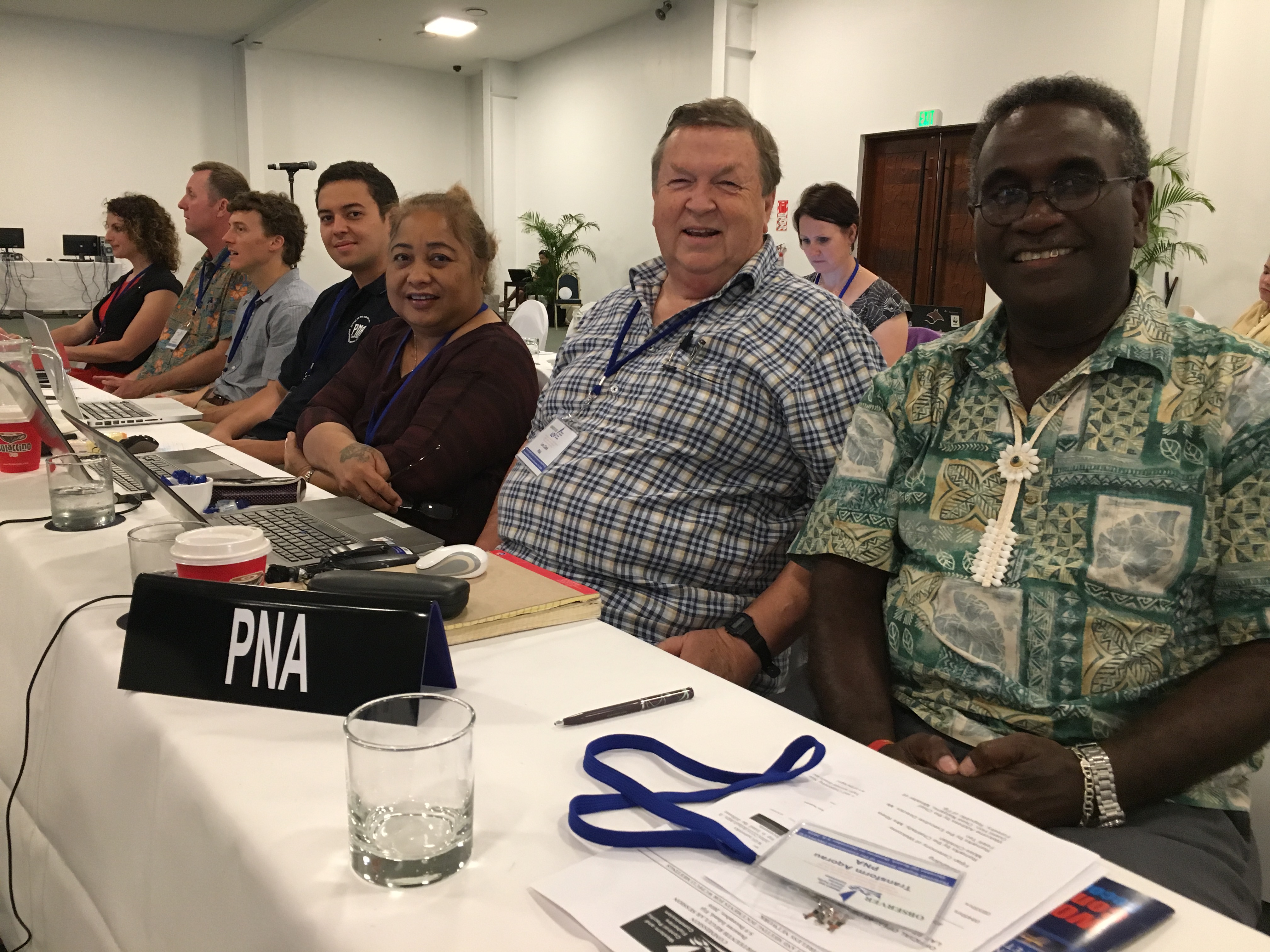 In this file photo from the Western and Central Pacific Fisheries Commission annual meeting in Fiji in 2016, newly appointed PNA CEO Dr. Sangaalofa Clark is pictured third from right with other PNA advisors. From right: former PNA CEO Dr. Transform Aqorau, Les Clark, Dr. Sangaalofa Clark, and Melino Bain-Vete. Photo by Giff Johnson.