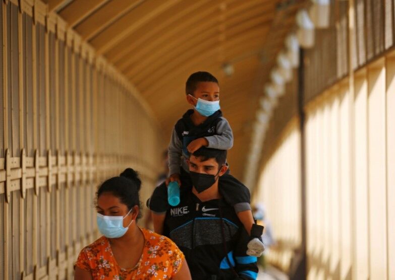 Central American migrants, who were airlifted from Brownsville to El Paso, Texas, and expelled from the United States under Title 42, walk toward Mexico on the Lerdo Stanton International Bridge, as seen from Ciudad Juarez, Mexico on Aug. 17, 2021.