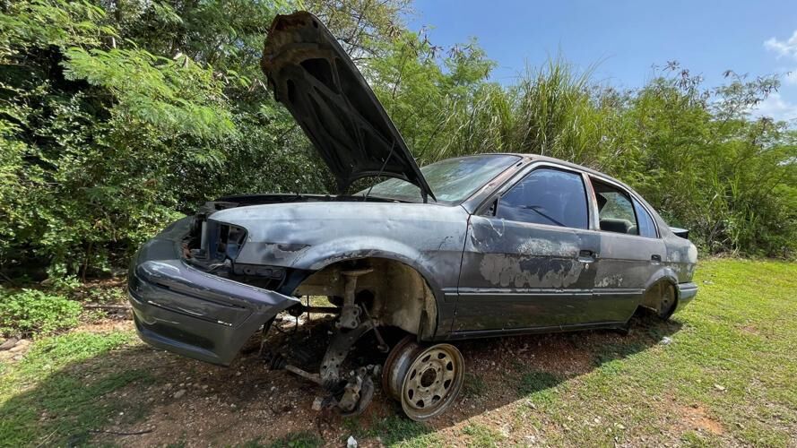 A stripped vehicle is seen abandoned on the side of a dirt road in Mangilao on Thursday, April 20, 2023.