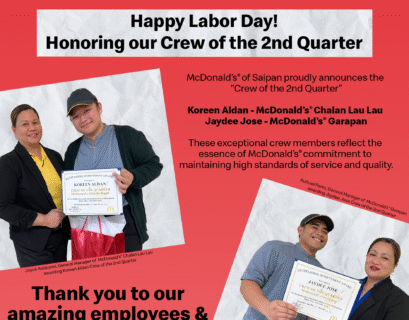 McDonald’s of Saipan proudly announces the achievements of its dedicated crew members from the two restaurants for the 2nd Quarter. The...