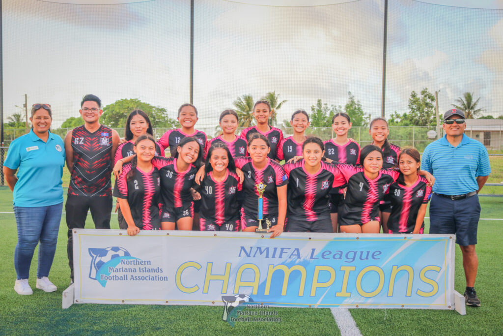 The Southern United Football Club members pose for a photo after defeating MP United, 7-2, to win the U17 girls division title on Saturday at the NMI Soccer Training Center in Koblerville.