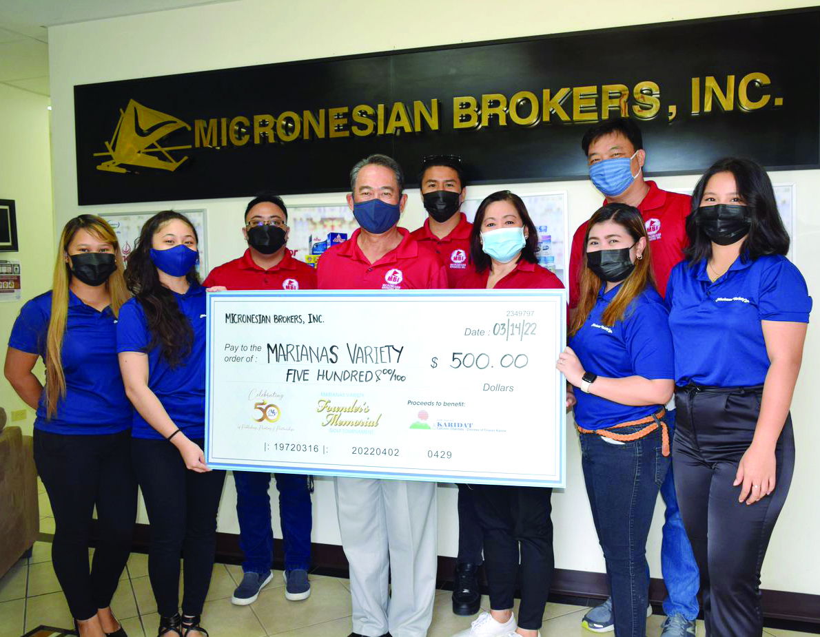 Micronesian Brokers Inc. General Manager Dennis Yoshimoto, center, and Inventory and Purchasing Manager Violy Hernandez, fourth right, hold a ceremonial check for $500 which they donated to the Marianas Variety Founder’s Memorial Golf Tournament set for Saturday, April 2 at 6 a.m., LaoLao Bay Golf & Resort, West Course. Also in photo are MBI Sales and Marketing Manager Mark Vasquez, third left, sales representative Ivan Devero, center back row, area sales manager Art Trajano, third right, Variety sales executives Diane Lumapas, left, Monique Mascarinas, second left, Gwendolyn Sandig, second right, and Hazel Nichole Sadian, right.