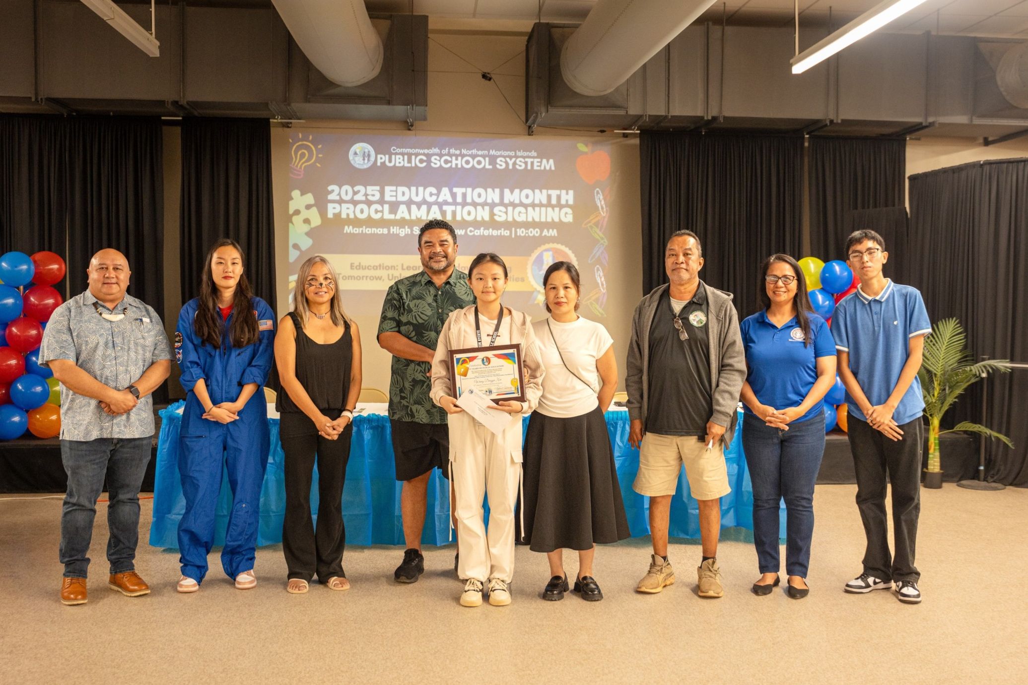 Second placer Zhu Xing Kai, center, receives his $450 cash prize from Saipan mayoral candidate Richard Lizama, left, and committee member Victoria Matsunaga, right.