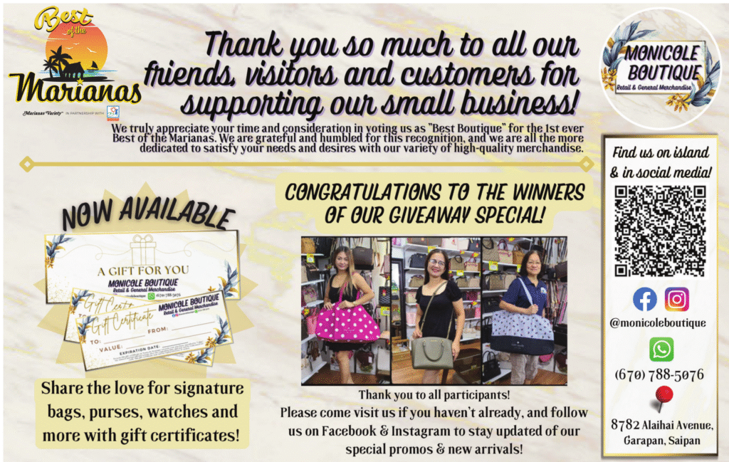 Monicole Boutique is grateful to the community for voting for them at the Best of the Marianas.