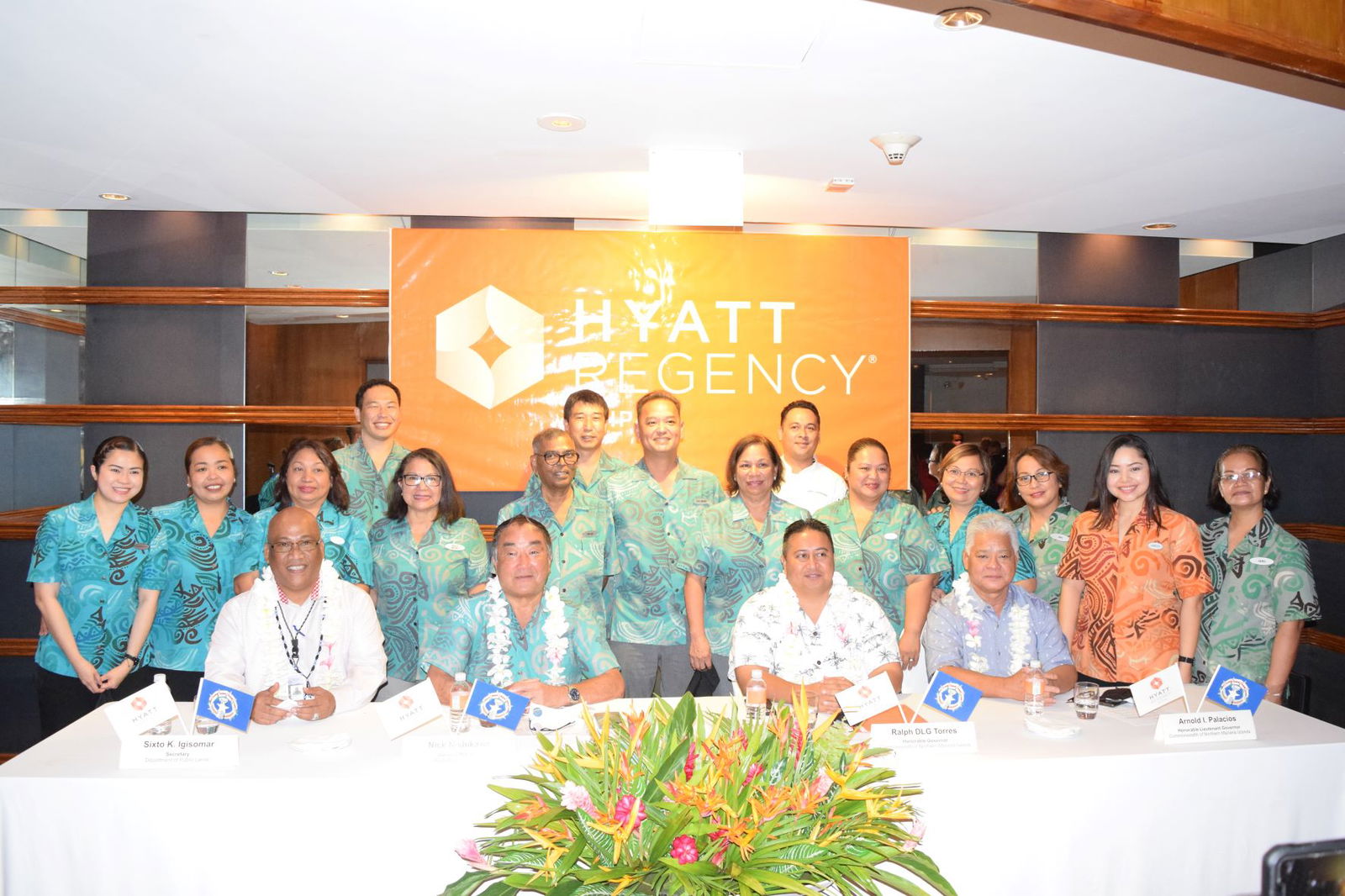 Hyatt Regency Saipan general manager Nick Nishikawa, second left seated, poses for a photo with Gov. Ralph DLG Torres, Lt. Gov. Arnold I. Palacios, Department of Public Lands Secretary Sixto K. Igisomar, and Hyatt staff shortly after a 40-year land lease deal was signed at Hyatt’s Miyako Restaurant on Friday.