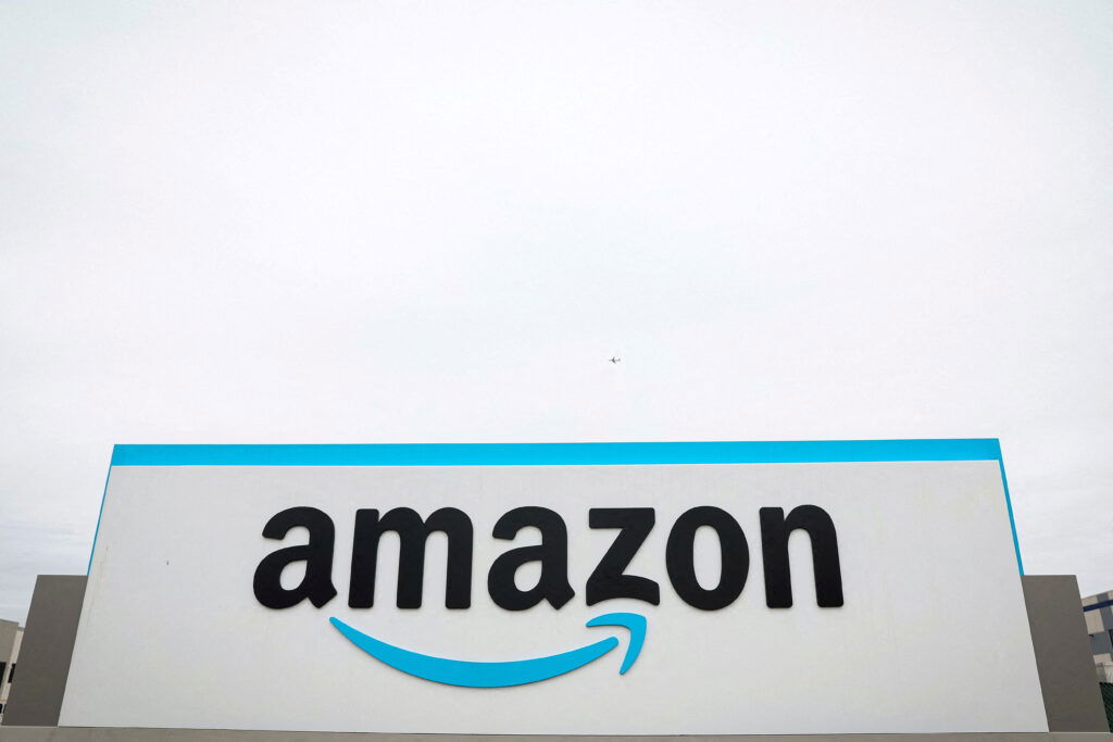 The Amazon logo is displayed on a sign outside the company’s LDJ5 sortation center in the Staten Island borough of New York City, April 25, 2022.