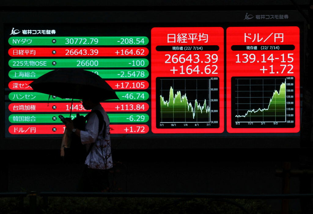 A man holding an umbrella is silhouetted as he walks in front of an electric monitor displaying the Japanese yen exchange rate against the U.S. dollar and Nikkei share average in Tokyo, Japan on July 14, 2022