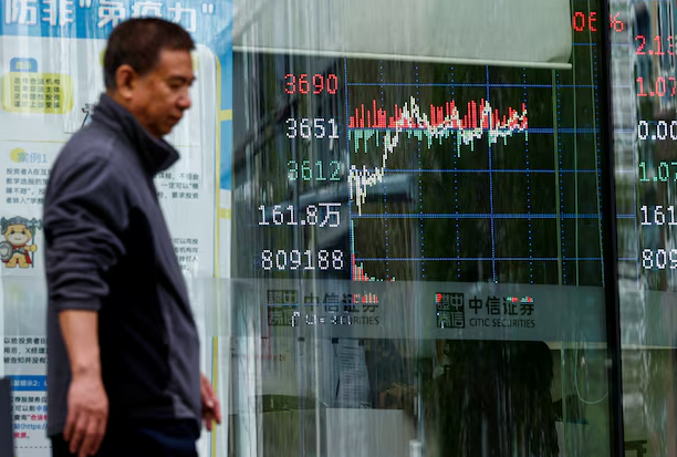 A man walks past a brokerage house with a display board showing the stock index information, in Beijing, China on April 9, 2025.