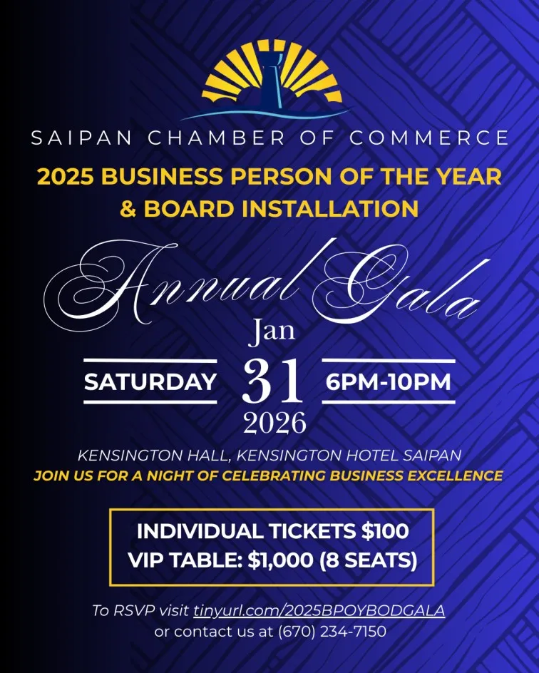 The Saipan Chamber of Commerce is a non-profit organization whose mission is to serve its members as a resource, enhancing the quality of business and life on Saipan. Its vision is to create an island where businesses, families, and communities succeed as one. To learn more, visit www.saipanchamber.com/, call (670) 234-7150 or email contactus@saipanchamber.org/.