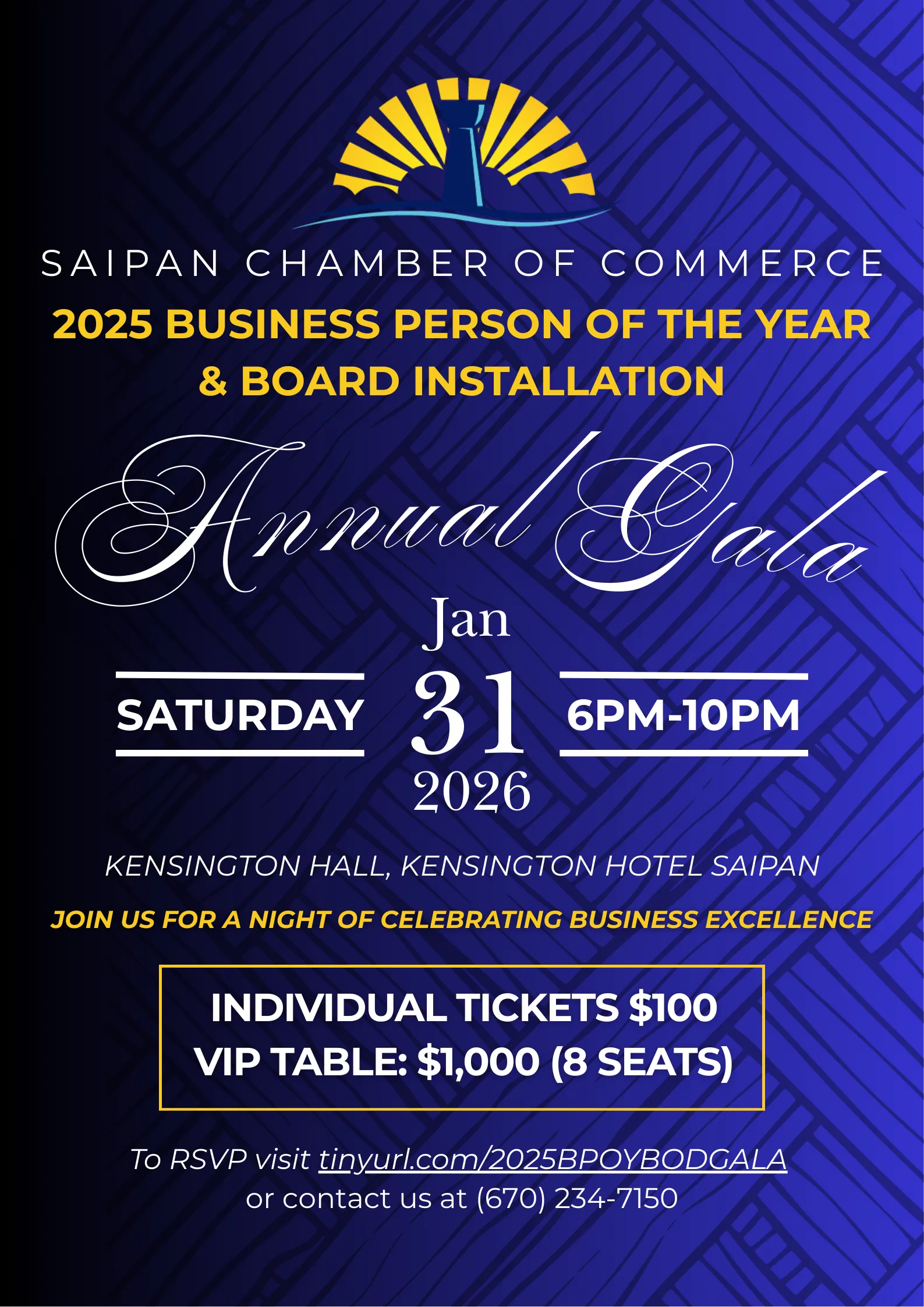 The Saipan Chamber of Commerce looks forward to welcoming members, partners, and guests to this unforgettable evening as we celebrate leadership, excellence, and the bright future of the CNMI.