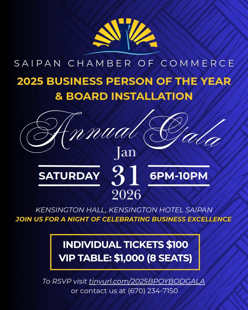 (SCC) — The Saipan Chamber of Commerce is delighted to announce its most anticipated annual celebration, the 2025 Business Person of the Year & Board of Directors Installation Gala, taking place on Saturday, Jan. 31, 2026, from 6 p.m. to 10 p.m. at the elegant Kensington Hall, Kensington Hotel Saipan. This signature event brings together leaders from across the private, public, and nonprofit sectors for an evening dedicated to honoring excellence, strengthening community connections, and celebrating the spirit of business in the Marianas.