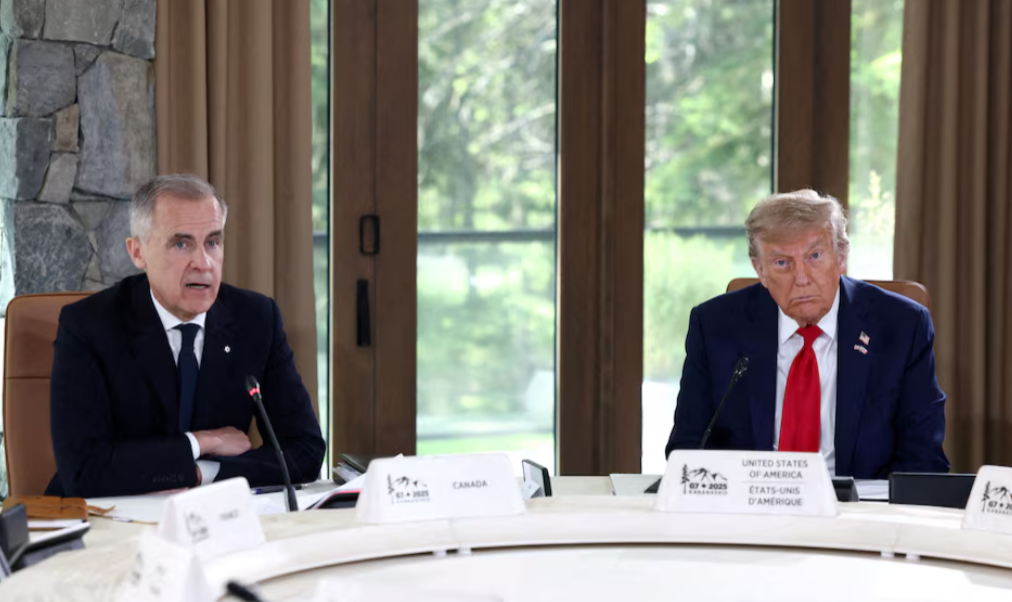 President Donald Trump and Canadian Prime Minister Mark Carney attend a meeting with G7 leaders and guests, at the G7 summit in Kananaskis, Alberta, Canada, June 16, 2025.