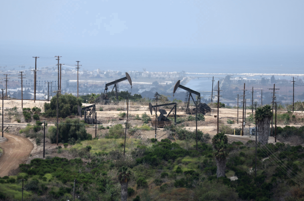Pump jacks operate in an oil field in Los Angeles, California, June 17, 2022.