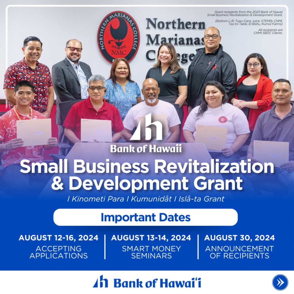 Applications for the Bank of Hawaii “I Kinometi Para I Kuminidat I Isla-ta” Small Business Revitalization & Development Grant will be accepted from Aug. 12 to 16, 2024. The Smart Money Seminars will follow on Aug. 13 and 14, 2024, with the announcement of grant recipients scheduled for Aug. 30, 2024.