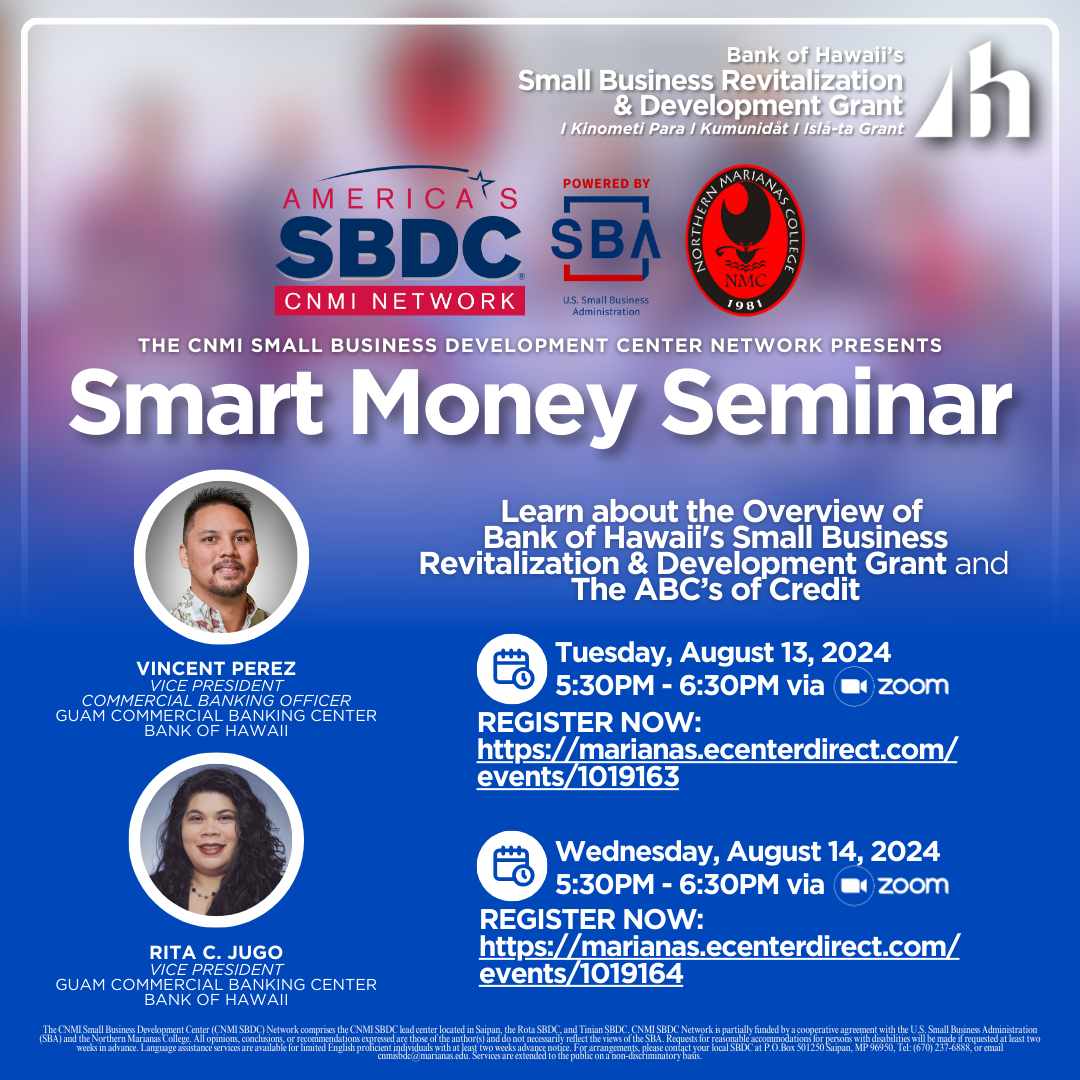 The “Smart Money Seminar” will offer an overview of the grant and a workshop on the ABCs of Credit, a critical component for financial success. The seminar will be held twice to accommodate all interested participants: the first session will take place on Aug. 13, featuring guest speaker Vincent Perez, vice president and commercial banking officer of BOH Guam Commercial Banking Center, and the second session on August 14, with guest speaker Rita C. Jugo, vice president of BOH Guam Commercial Banking Center. Both sessions will be conducted via Zoom from 5:30 p.m. to 6:30 p.m.