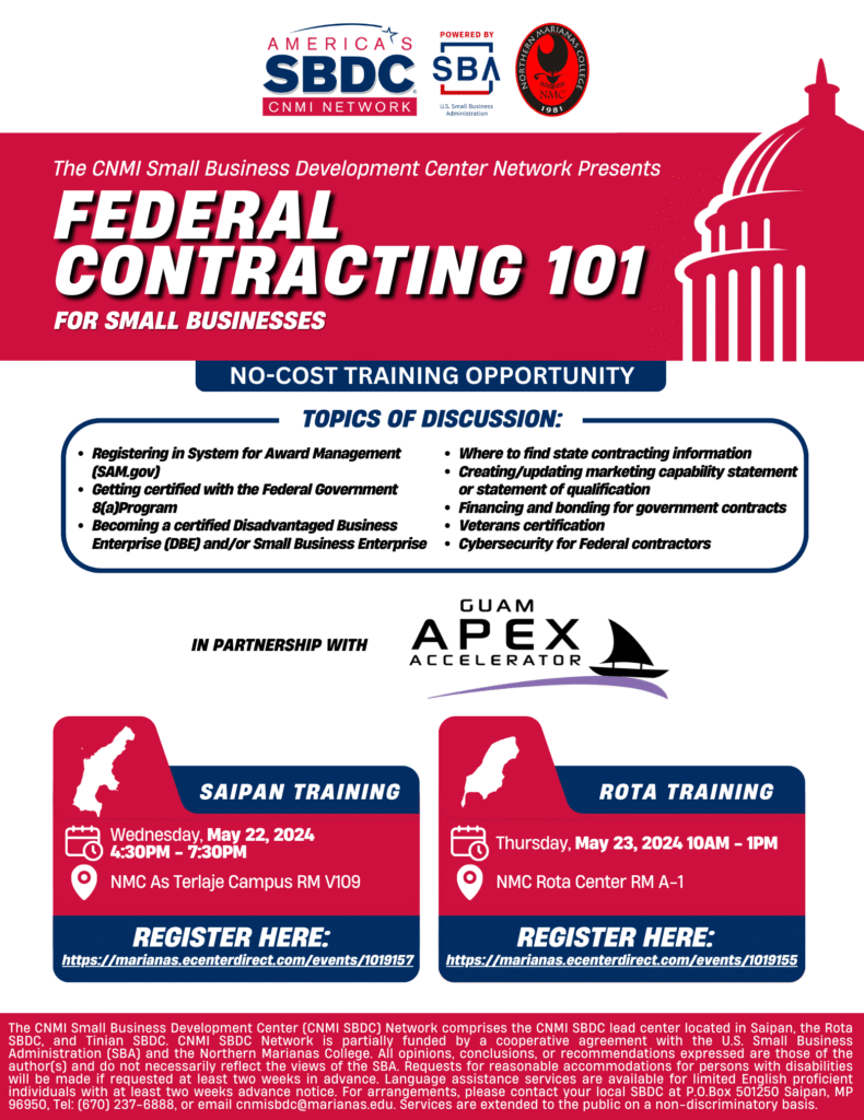 On Wednesday, May 22, 2024, the CNMI SBDC will be hosting “Federal Contracting 101,” a training opportunity for SBDC clients and local businesses to learn how to develop capacity towards bidding for military and/or federal contracts. The training will be held at 4:30 p.m. in Room V109 at the Northern Marianas College campus in As Terlaje, Saipan.