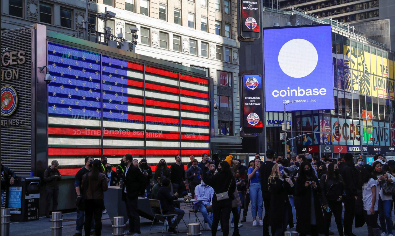 Employees of Coinbase Global Inc, the biggest U.S. cryptocurrency exchange, watch as their listing is displayed on the Nasdaq MarketSite jumbotron at Times Square in New York on April 14, 2021.