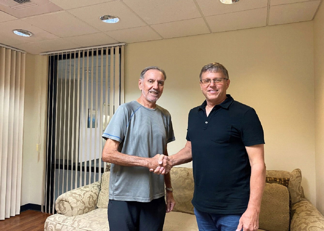 David Hood, right, and Marianas Coffee’s Chuck Jordan shake hands after the purchase of Marianas Coffee Company.
