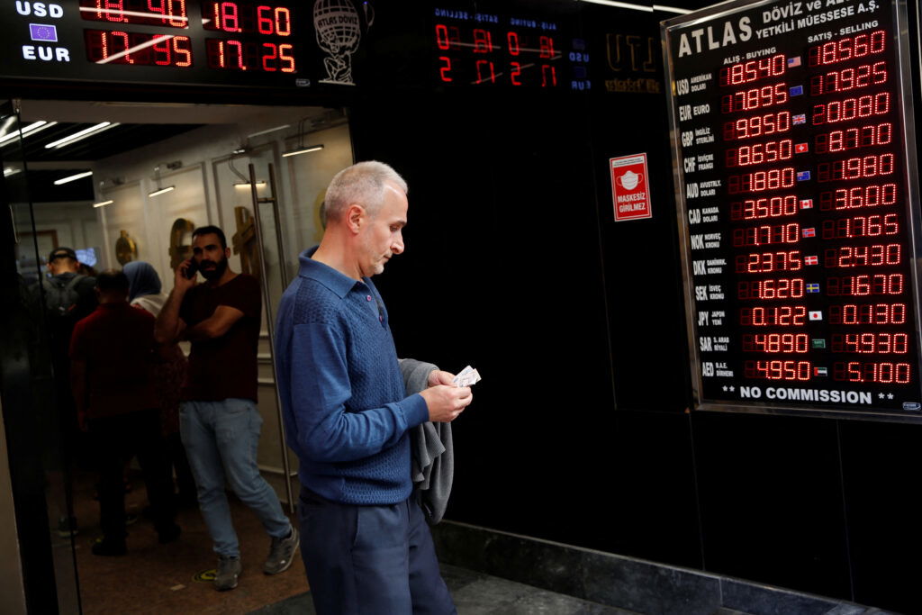A man counts his money as he leaves a currency exchange office in Istanbul, Turkey September 26, 2022. REUTERS/Dilara Senkaya/File Photo