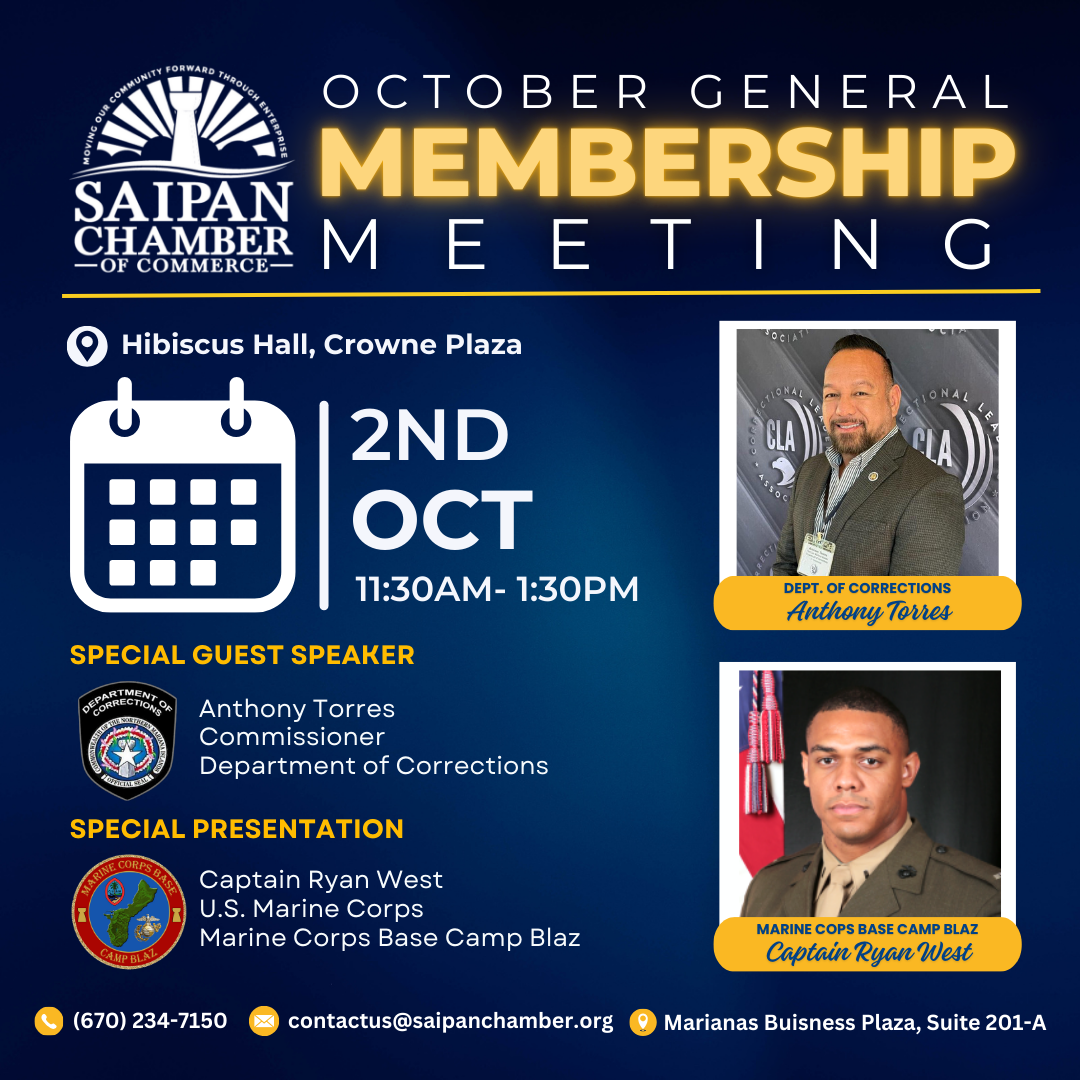 (SCC) — Hafa Adai yan Tirow from the Saipan Chamber of Commerce! SCC is excited to host its October general membership meeting on Wednesday, October 2, 2024 from 11:30 a.m. to 1 p.m. at a chamber member establishment, Crowne Plaza Resort, Hibiscus Hall