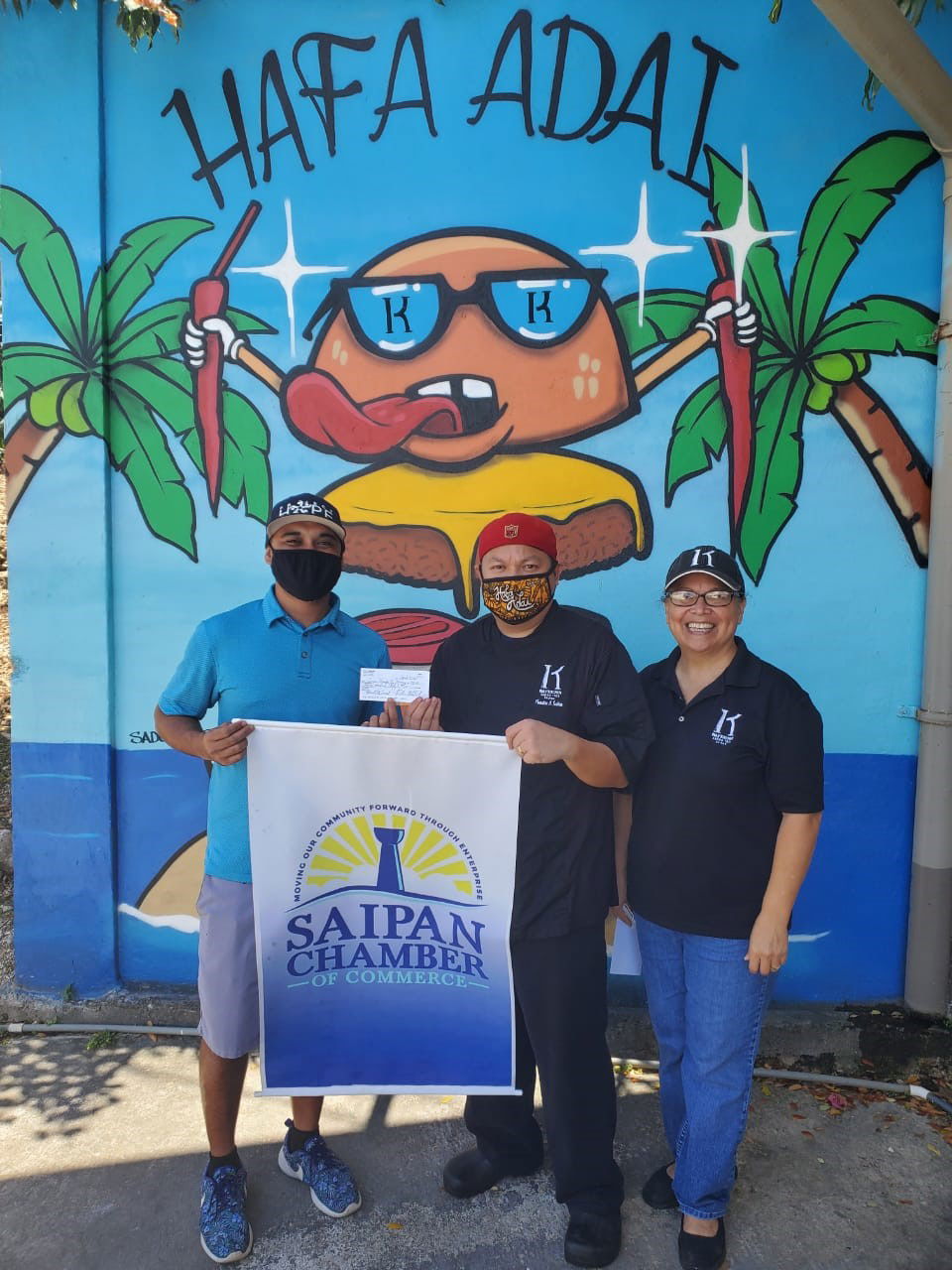 From left, Saipan Chamber of Commerce financial and data management coordinator Franco Santos, Inas’ Kitchen co-owners Sonnie Sablan and his mom, Rita Sablan.