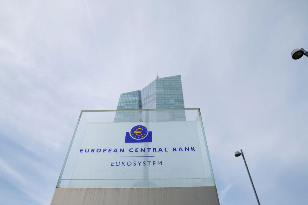 A view shows the logo of the European Central Bank outside its headquarters in Frankfurt, Germany March 16, 2023.