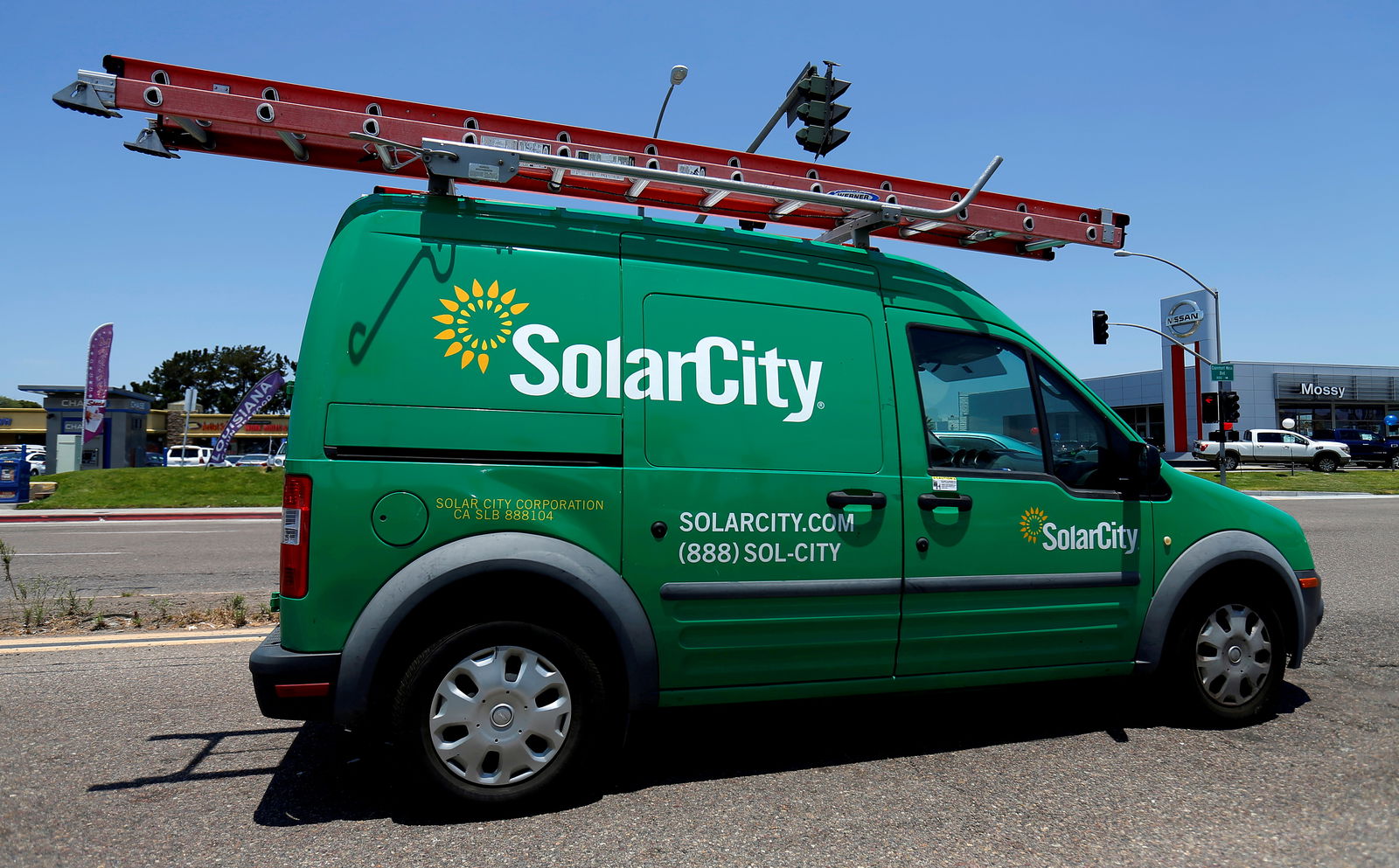 A SolarCity vehicle is seen on the road in San Diego, California on June 22, 2016.