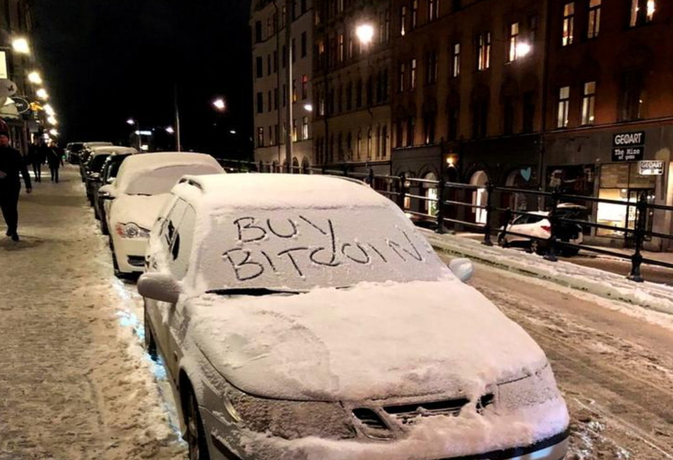 A car with a sign “Buy Bitcoin” written in snow is pictured in Stockholm, Sweden on Jan. 16, 2021.