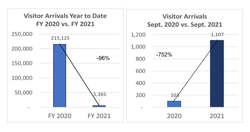 From the U.S., 164 visitors arrived, marking a 179% increase compared to September 2020, and 108 visitors arrived from the neighboring island of Guam, a 13 % increase for the month. A combined 34 additional visitors from all other destinations visited in September.