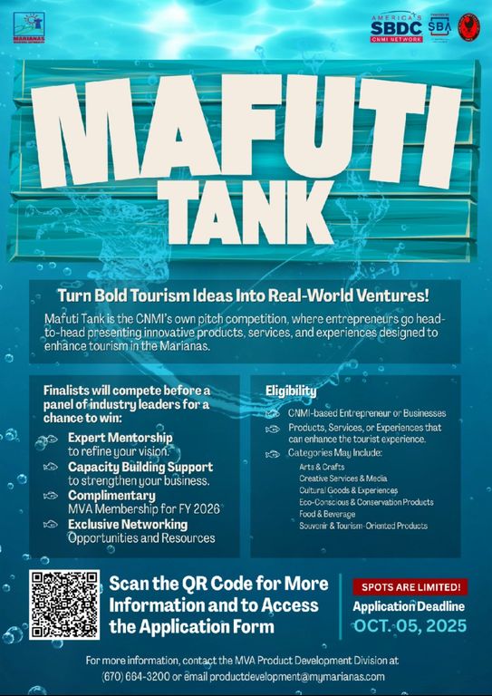 (MVA) — Innovators hoping to take their tourism ideas to the next level have until Sunday, Oct. 5, to register for the Marianas Visitors Authority Mafuti Tank competition.
