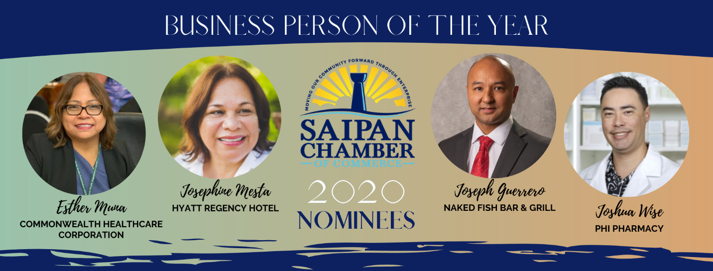 (SCC) — The Saipan Chamber of Commerce is proud to announce the four nominees for the 2020 Business Person of the Year Award: Joseph C.  Guerrero (Naked Fish Bar & Grill), Josephine DLG Mesta (Hyatt Regency Saipan), Esther Muna (Commonwealth Healthcare Corporation), Joshua Wise (PHI Pharmacy). The nominees for Business Person of the Year are all active members of the chamber, gracious in their support of the community, and business leaders advocating for our economy and our enterprises.