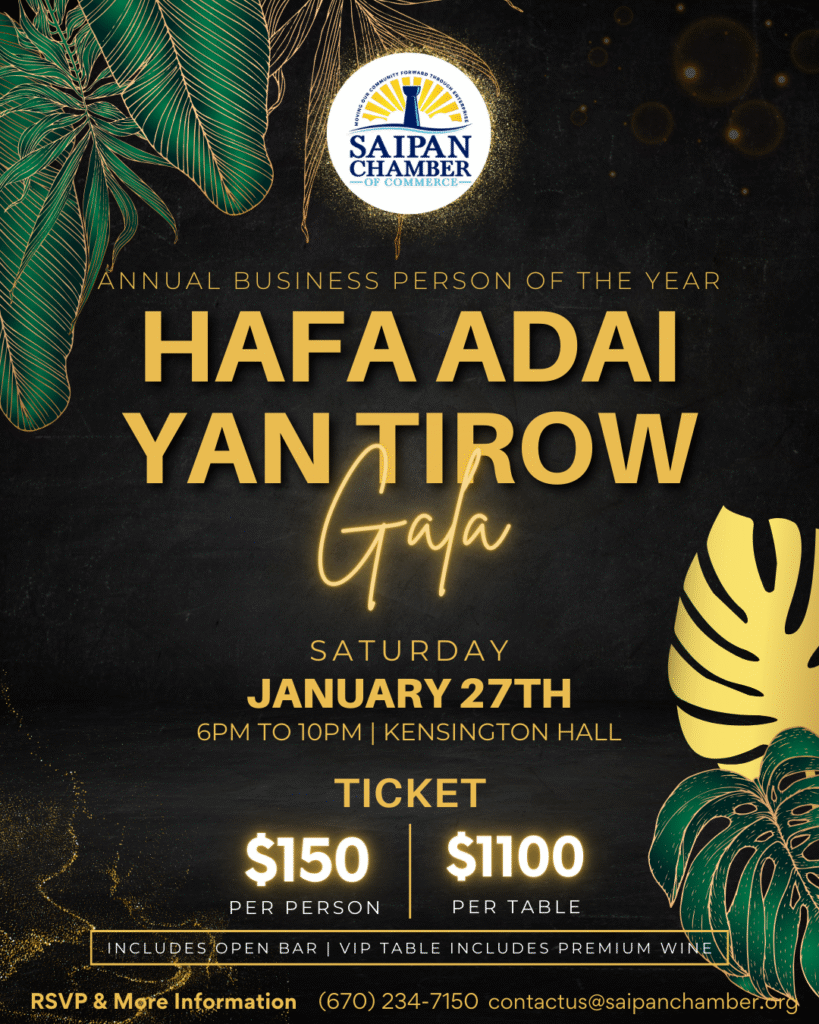 (SCC) — The Saipan Chamber of Commerce is hosting its signature event of the year, the Annual Business Person of the Year Gala on Saturday, Jan. 27, 2024, at Kensington Hall, Kensington Hotel Saipan with the theme “Hafa Adai yan Tirow.” This memorable event not only honors business excellence in the CNMI but also serves as a platform for the induction of the newly elected and returning board of directors.