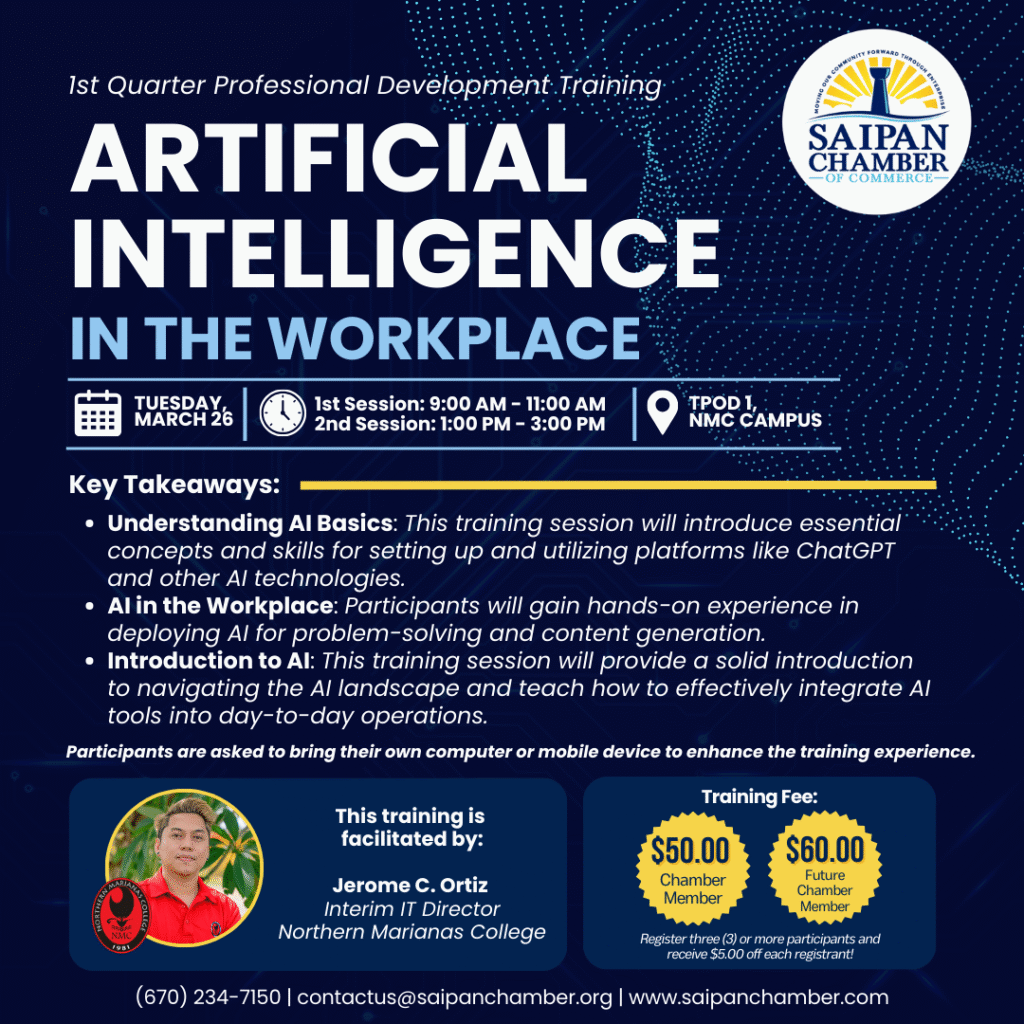 (SCC) — The Saipan Chamber of Commerce is thrilled to announce the upcoming 2024 1st quarter professional development training, centered around “Artificial Intelligence in the Workplace.”
