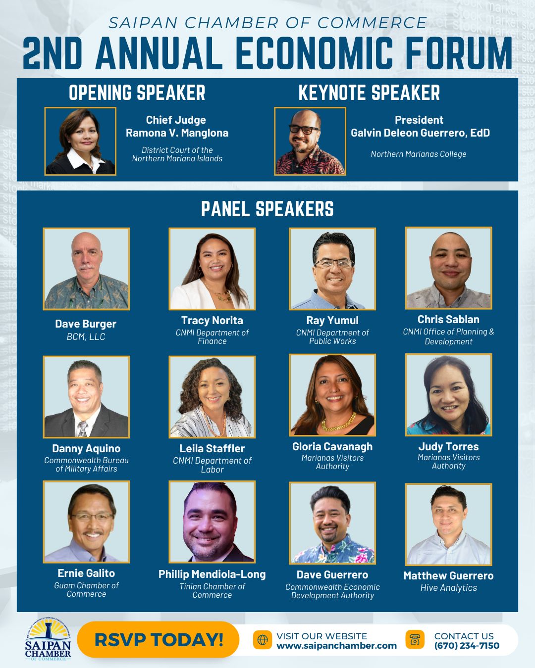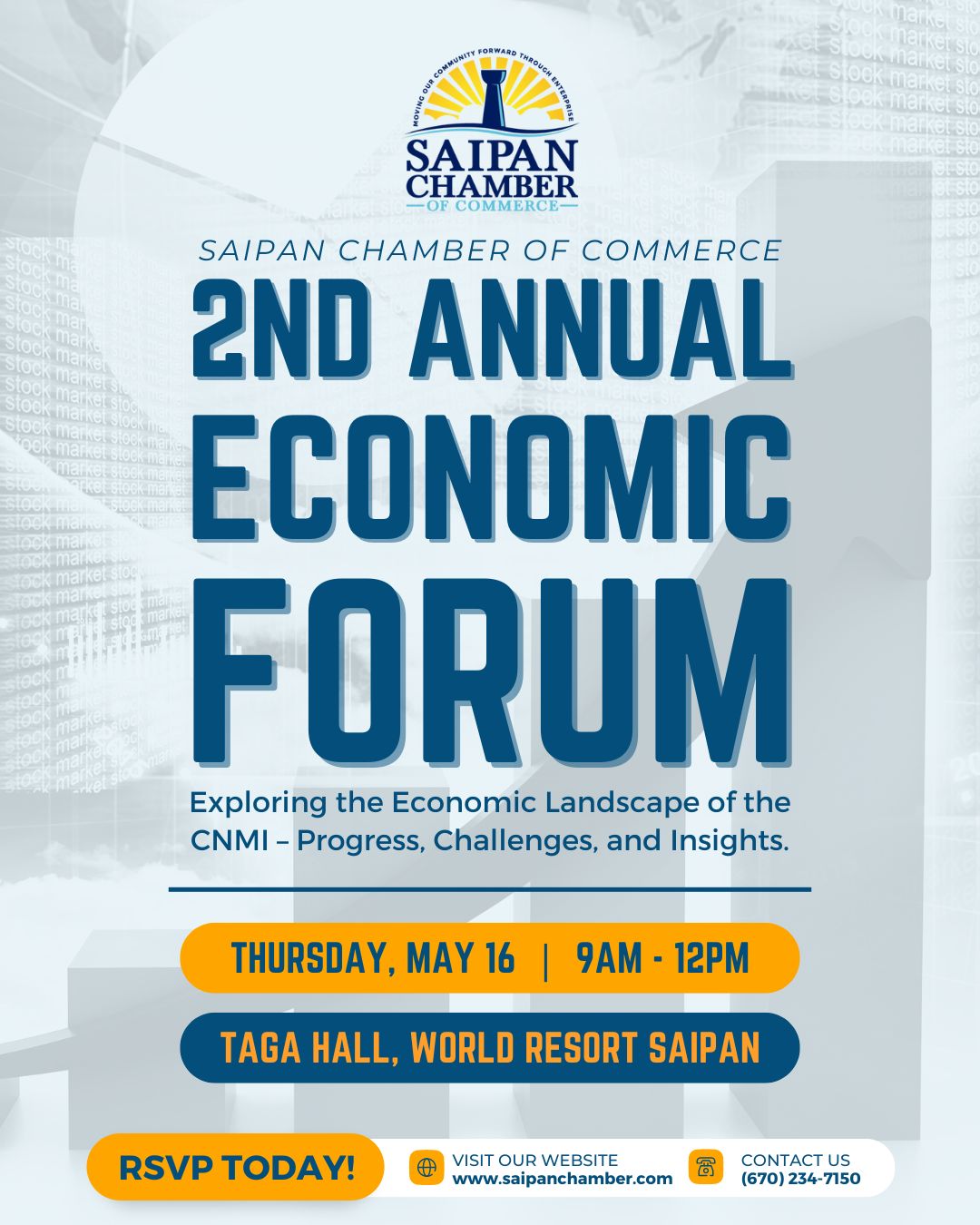 (SCC) — The Saipan Chamber of Commerce will be hosting its 2nd Annual Economic Forum, featuring a diverse panel of stakeholders for the purpose of analyzing economic conditions, challenges, and opportunities. The forum will take place on Thursday, May 16, from 9 a.m. to 12 p.m. at the Taga Hall in World Resort Saipan.