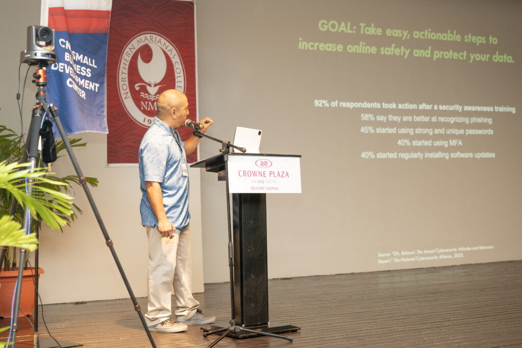 Kicking off the event in the morning general session was a presentation highlighting the need to shore up cybersecurity defense titled “Cybersecurity Defense: Mitigating Risks on the Offense.” Presented by the owner of KRS Cyberworx, Herman M. Kintol, a local cybersecurity expert, Kintol underscored the need for the CNMI to improve its cybersecurity posture as heightened threats of attacks become more prevalent in the Marianas, signaling the urgent need for better cybersecurity. In this session, participants learned practical and affordable steps to enhance cybersecurity based on recommendations from leading security organizations.