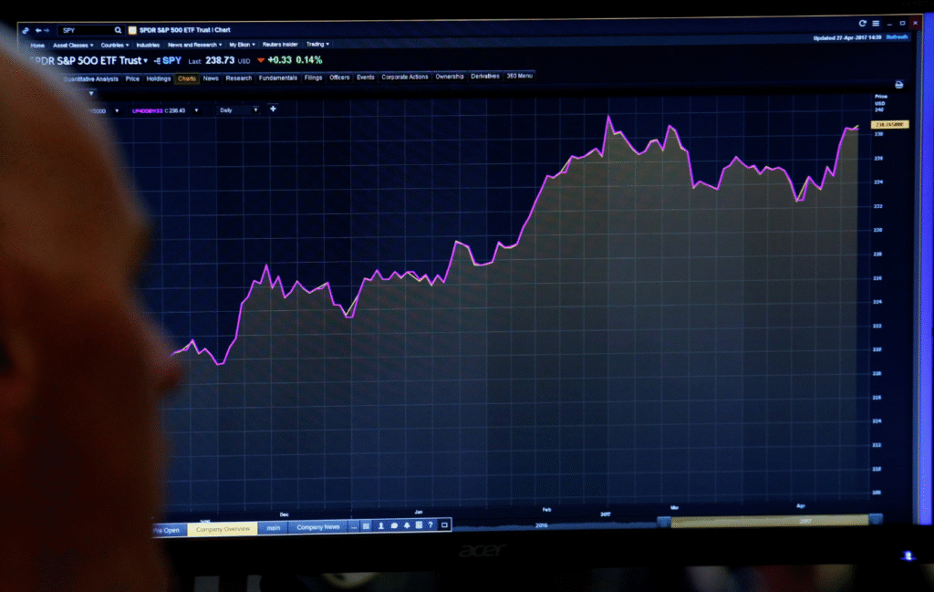 A trader looks at a screen that charts the S&P 500 on the floor of the New York Stock Exchange in New York, April 27, 2017.