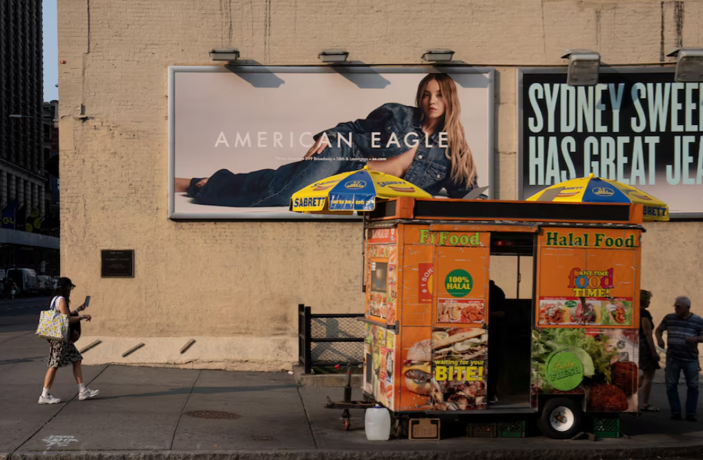 A woman walks near an American Eagle ad campaign featuring Sydney Sweeney in New York City, Aug. 4, 2025.