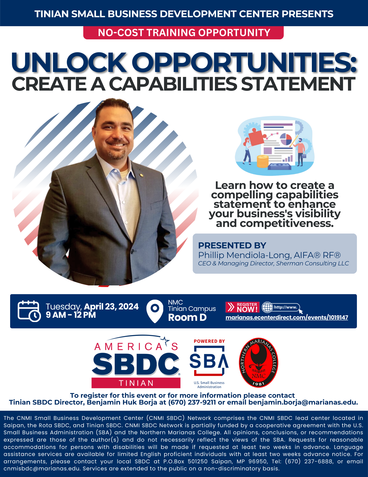 “We are excited to offer this valuable training opportunity to the business community on Tinian,” said Benjamin Huk Borja, Tinian SBDC director/business advisor. “A well-crafted capabilities statement can make a significant difference in attracting potential clients and partners. We encourage all local businesses, current, and aspiring entrepreneurs to join us for this informative session.”