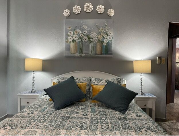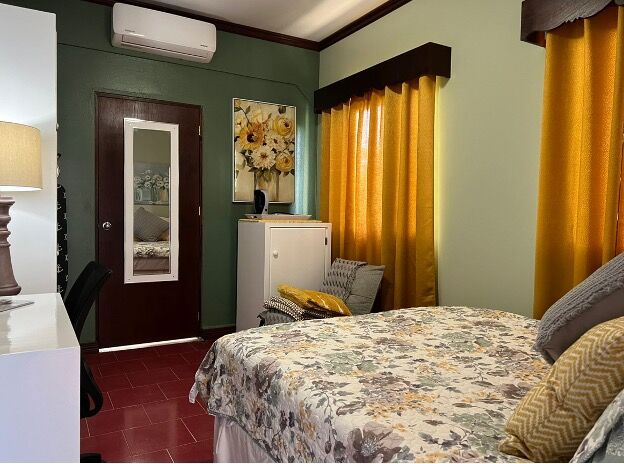 Amenities for guests at the Tinian Garden B&B include breakfast at the Bar-K Diner, conveniently located next door. A private bathroom, air-conditioning and wifi can be found in all rooms, choice of bed size between queen and twin, large artisan ceiling fans, safes, mini refrigerators and streaming Smart TV in all rooms, ironing board and iron in all rooms, hot water kettles and coffee amenities, on-site laundry facility, elegantly and inviting furnished living room, a large dining area, refrigerator, and a microwave oven inside the kitchen.