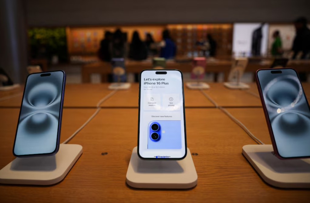 iPhones sit on display at the Apple Fifth Avenue store, in New York City, May 23, 2025.
